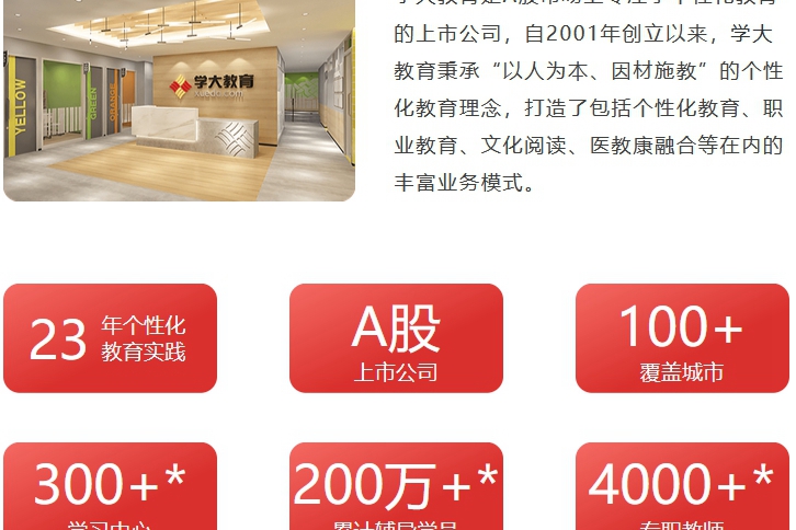 学大教育是A股市场上专注于个性化教育的上市公司,自2001年创立以来,学大教育秉承“以人为本、因材施教”的个性化教育理念,打造了包括个性化教育、职业教育、文化阅读、医教康融合等在内的丰富业务模式。作为个性化教育倡导者,学大秉承因材施教的教育理念,制定和实施以学生为中心教学体系及模式,并在其基础上逐步延伸发展成为“个性化智能教育”。历经20年,学大不断探索多元发展,同步发力国际教育及在线教育,2019年发布全新“双螺旋”教育模式,将以科技赋能个性化教育,多面开启智慧教育新时代。
