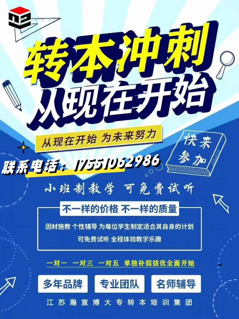 江苏瀚宣博大专转本,助你离成功更近一步!离梦想更近一步!江苏瀚宣博大专转本是五年一贯制高职生转本的福音,是江苏省唯1一家主做五年制专转本(五年一贯制专转本)的教育培训辅导机构,名师小班化教学,全日制上课模式,高考式复习,每月的摸底测试,及时掌握每一位学员学习情况。江苏瀚宣博大专转本拥有一批强大的全职师资阵容,精准的内部学习资料,全面分析南京晓庄、金陵科技学院、三江学院、苏大文正、苏大应用、淮阴工学院、盐城工学院等多家主考院校录取攻略,对各科考点进行查漏补缺,强化考试题型,提高解题速度,强化解题思维,并根据学员基础设置了周末班、考前班、寒暑假班、冲刺班,让学员深刻了解自己的长短处,专业课更有一对一辅导、一对五辅导,大大提高学员的转本通过率,省内更有苏州、常州、无锡、镇江、南通等多家分校,参加2026年、2027年五年制专转本考试的学生,零基础开始,针对基础薄弱,想冲刺高分的同学。一线老师,多年转本经验的全职老师,循环滚动开班,随到随学。更多五年制专转本备考详情及预约免费试听可联系瀚宣博大专转本贾老师1755(微)1062(同)986。