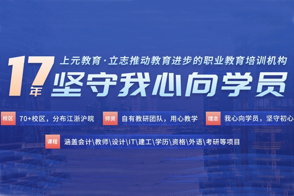 2005年,上元在桐乡起步,从捷梯教育开始,十年的时间,公司从一个单一校区,单一品牌的小机构,迅速成长为拥有上元会计、兴元设计、上元资格、上元教师、捷梯学历、登元建工、上元 IT、思元外语、上元考研九大品牌,横跨中国经济活跃的江苏、安徽、上海,浙江四地。